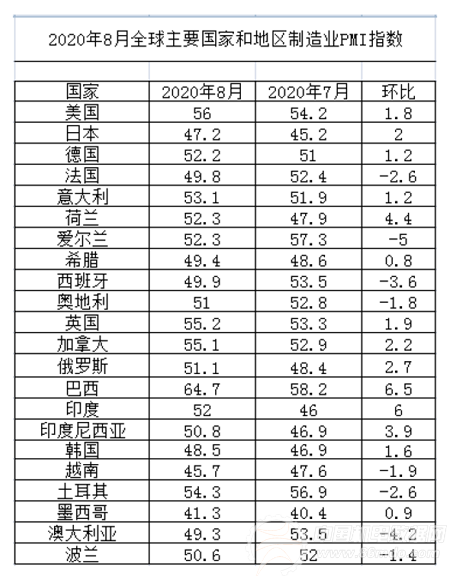 2020年8月份,亚洲制造业PMI较7月上升1.2个百分点至50%,印度和印尼制造业PMI回升至50%以上;日本和韩国制造业PMI虽仍在50%以下,但较7月有不同程度上升;新加坡制造业PMI连续两个月稳定在50%以上。8月份,中国制造业PMI为51%,较7月小幅回落0.1个百分点,连续两个月稳定在51%左右,经济保持平稳复苏态势。从分项指数来看,市场需求加快回升,供需协同性增强,新动能加快复苏,大中型企业较快增长,经济高质量发展具备基础。