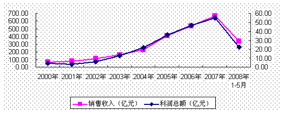 图2 2000-2008年5月我国模具制造业收入与盈利状况