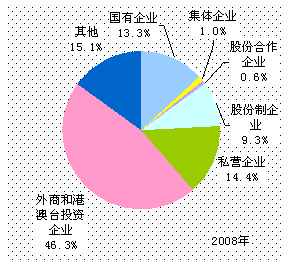 由上图可看出,我国交通运输设备制造业自2004年开始出现国际贸易顺差,且金额差距不断扩大。到2008年前8个月就实现贸易顺差200多亿美元。但联系我国交通运输设备制造业企业性质分布来看,在华投资的国外资产大幅上升,虽然目前出现更大的贸易顺差,但这主要是全球产业转移造成的。(