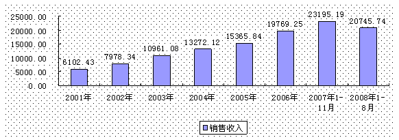 我国交通运输设备制造业近8年来保持稳定快速的增长势头,行业扩张迅速。行业销售收入在2001年仅为6102.43亿元,而2008年仅前8个月收入就突破了两万亿元。