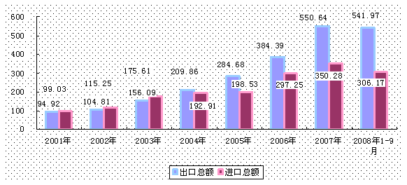 图3 2001—2008年9月我国交通运输设备制造业进出口总额