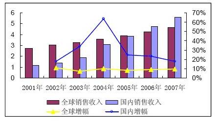 图3 2007年全球及我国电子信息产业销售收入及增长情况