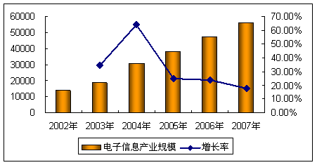 由上图我们可以看出,2002-2007年,电子信息产业保持快速发展。很明显,电子信息产业在2004年发展速度最快,在此基础上,接下来的三年发展较2004年有所减慢,但从总体来讲,一直都在保持不断增长的势头。