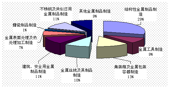 2006年,我国金属制品工业的市场规模达到8123.52亿元,其中结构性金属制品占市场份额的29%,略高于企业数量占比,搪瓷制品制造业仅占整个金属制品工业的1.09%。