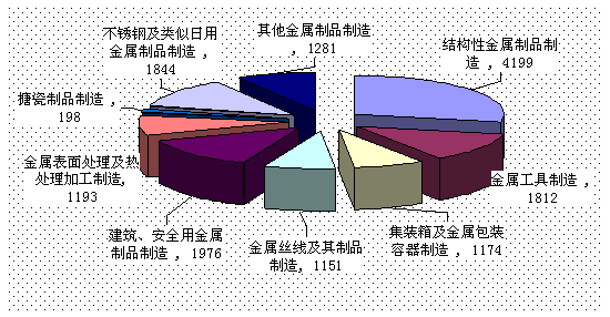 按《国民经济行业分类》标准,金属制品业主要包括9大细分行业。2006年,我国金属制品业的企业数量达到14828家。其中,结构性金属制品行业企业数量达到4199家,占据整个金属制品工业的28.31%,位列各细分行业之首;紧随其后的是建筑、安全用金属制品制造业,占整个金属制品工业的13.33% ,不锈钢及类似日用金属制品制造业和金属工具制造业仅相差32家,分别占整个金属制品工业的12.44%和12.22%。搪瓷制品制造业的企业数量最少,为198家,仅占整个行业的1.34%。