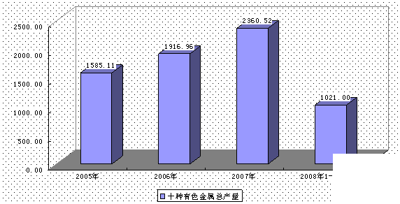 近几年中国有色金属工业保持了良好的发展态势,我国2005年十种有色金属总产量为1585.11万吨;2006年为1916.96万吨,较2005年增长了20.94%;2007年首次突破2000万吨大关,达2360.52万吨,同比增长23.14%。已连续6年居世界第一。2008年前五个月就达到了1021万吨,同比增长12.2%。有色金属商业企业的直接融资额再创历史新高,越来越多的资本开始涉足有色金属行业。