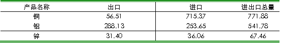 我国的主要有色金属产品包括铜、铝、铅、锌、镁、镍、锡、锑等,其中产量在百万吨以上的包括铜、铝、锌和铅等。而2007年我国进出口贸易中进出口量居前3的有色金属产品分别是铜、铝和锌,其中,铜、铝、锌进出口分别为771.88万吨、541.78万吨和67.46万吨,三者合计占全部有色金属进出口总量的85.7%。