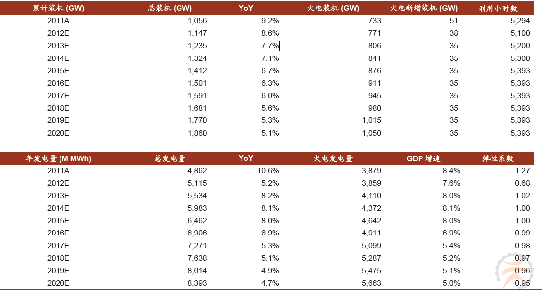 表1 预计2013-2015 年新增火电装机仅35GW,仍能支持8.0%GDP 增速