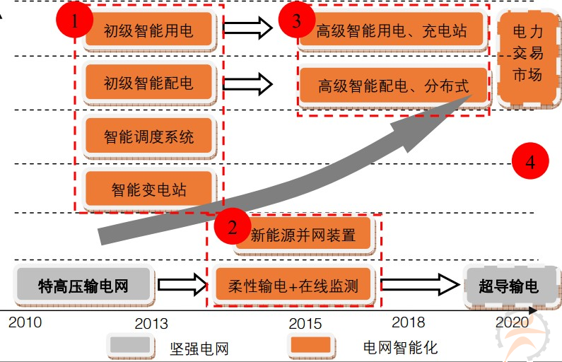 智能电网的建设重点是电网智能化,而非特高压,重点是二次设备,而非一次设备。智能电网的核心特征:信息化、自动化、互动化,层层递进,最终实现电网智能化。预计在科技创新、电力市场化改革两大因素的推动下,2015年前后,我国的智能电网建设将全面转向电网智能化的六大方面:发电、智能输电、智能化变电站、智能配电网、智能用电、智能调度。