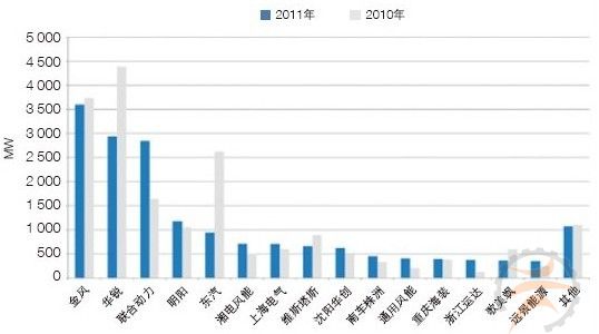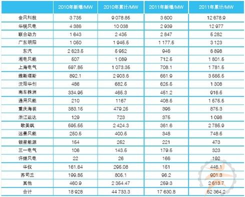 金风和华锐在装机容量上都比2010年有所下降,不过,它们2011年仍然分别保持了中国市场第一和第二的位置。此外,金风和华锐在新产品研发、国际市场拓展等方面的业绩也是可圈可点。金风、华锐、联合动力和明阳均排在2011年全球十大制造商之列。