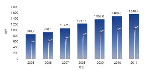 2011年中国新安装的风力发电机组11 409台,平均功率1 545.4kW,与2010年相比继续保持增长。在2010年新增风电装机中,功率为1.5MW的机型仍然保持绝对优势,占新增装机容量的74.1%,功率为2MW的机型占14.7%,2.5MW以上的机组占3.5%,其他如1MW、1.25MW、1.6MW、1.65MW、2.1MW、2.3MW机型累计占5.3%,而功率小于1MW的风电机组仅占2.4%。从风力发电机组技术特点来看,采用增速齿轮箱、双馈发电机的变桨变速型风电机组因为技术较为成熟,在市场上供应量较多;无增速齿轮箱、采用同步发电机和全功率变流器的直驱型风电机组正受到更多的关注,也有更多的企业参与到这类机组的研发、设计和制造中来。