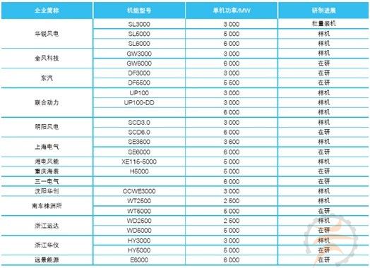 海上风电在国内、国外都是风电开发的重要方向。因此,许多跨国公司都宣布了研制更大功率风电机组的计划,功率范围多集中在4~7MW,其中德国研制的6MW和7.5MW机组已经在陆地试运行。据不完全统计,到2011年为止中国大约有20家整机企业宣布了研制多兆瓦级大功率风电机组的计划,功率范围多集中在3~6MW。其中2011年5月,华锐6MW风电机组的下线,2011年12月,国电联合动力技术有限公司6MW风电机组下线,这标志着中国风电机组大型化研制已经迈上一个新的台阶。