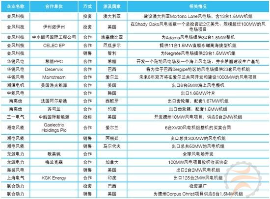 2011年中国企业海外布局明显加快,许多风电设备制造企业都成立了海外市场部,积极拓展国际市场。据企业自己公布的消息,2011年华锐在巴西获得风电机组采购订单,联合动力、三一电气、重庆海装在美国各获得订单,上海电气在印度获得订单,金风科技则在美国、澳大利亚、智利、厄瓜多尔、埃塞俄比亚等均有收获。