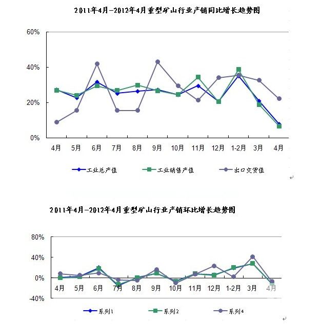 2012年1-4月份,全国重型矿山机械行业的发展形势有所放缓,工业总产值和销售产值增速分别为14.59%和15.03%;出口交货值的增速大幅提升,累计同比增长了29.57%。