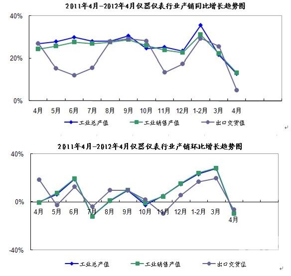 2012年1-4月,全国仪器仪表行业增长减速,产销增速在15%以上,出口增速也有所下降。