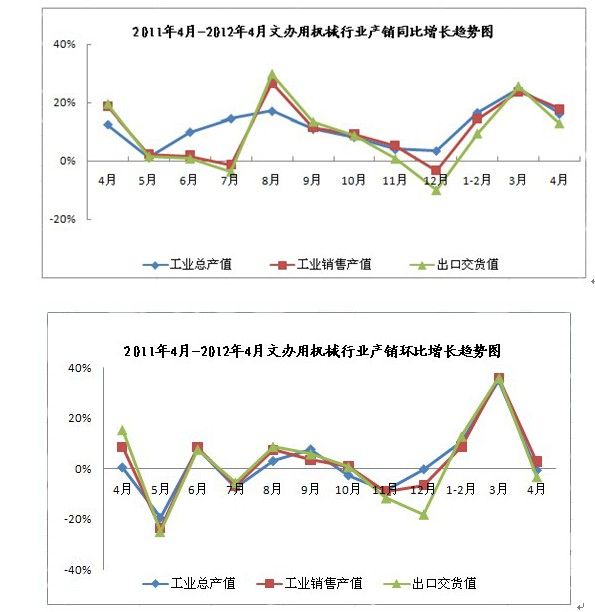 2012年1-4月,全国文办机械行业完成工业总产值581.19亿元,累计同比增长11.95%;累计完成销售产值570.49亿元,累计同比增长11.79%。