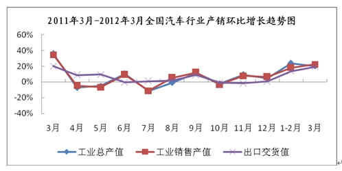 2012年3月,汽车产销表现较好,为历年3月份产销最高水平,其中商用车环比增速快于乘用车。1-3月,汽车产销同比下降1.83%和3.40%,与1-2月相比,降幅进一步收窄。