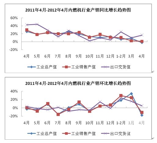 2012年1-4月,全国内燃机行业累计完成工业总产值566.75亿元,同比增长-5.26%;实现累计销售产值564.86亿元,同比增长-5.73%;1-4月行业累计产销率为99.67%。