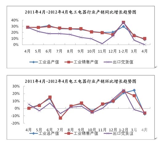 2012年4月,电工电器行业产销及出口交货值同比增长大幅度下滑;同样环比增长也有不同程度地下落。