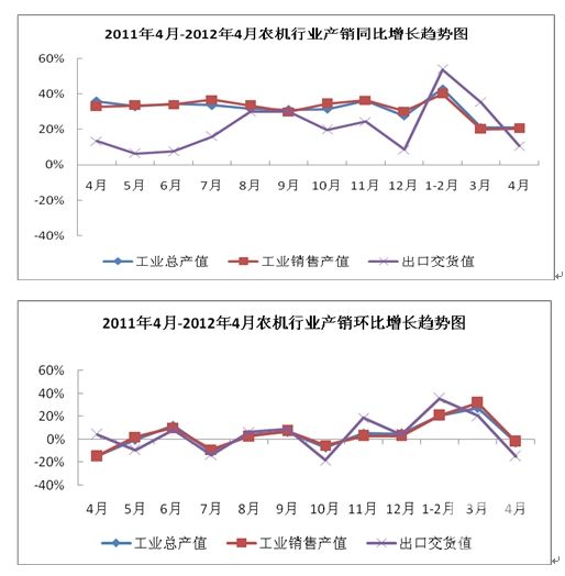 我国农机行业在2012年4月份的产销情况同比略有小幅增长,环比大幅度下滑的态势,出口交货值也有所大幅度地回落。数据显示,1-4月农机行业产销累计同比增速分别为22.48%和21.65%,较上月有所下降,出口交货值同比增长则从24.80%下滑到18.10%,行业产品产量均有不同程度地降低。