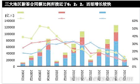 从增速来看,东部地区新签合同额增速同比放缓21.4%,中部地区新签合同额增速同比放缓10.5%,西部地区新签合同额增速同比放缓11.2%。