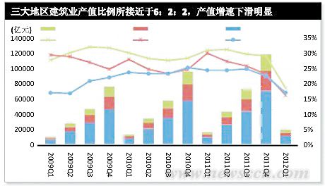 从已发布的2012年第一季度全国各省份建筑业产值来看,东部地区、中部地区和西部地区的建筑业产值分别为11009.2亿元、4353.5亿元和3468.0亿元;从新签合同额来看,东部地区、中部地区、西部地区今年第一季度新签合同额分别为14716.6亿元、5217.6亿元、4180.1亿元。由以上数据可以看出,我国建筑业呈不均衡性发展,3个地区新签合同额比例接近6:2:2,东强西弱的格局依然没变。