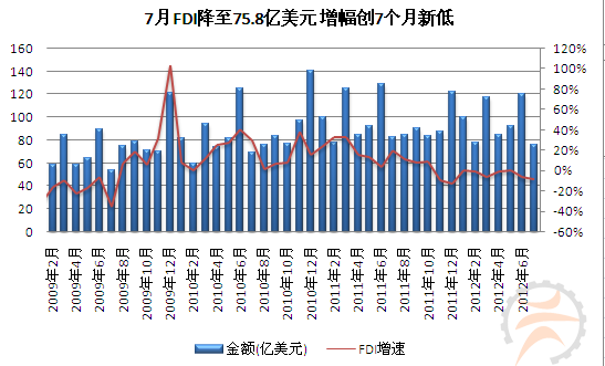 商务部今日召开新闻发布会通报7月经济运行情况。发言人沈丹阳称,7月实际使用外资金额75.8亿美元,同比下降8.7%。前7月实际使用外资金额666.7亿美元,同比下降3.6%。统计数据显示,7月FDI再次负增长,增速创下了今年以来新低。