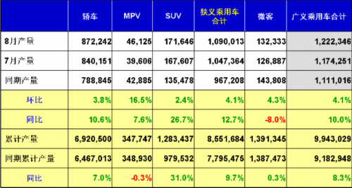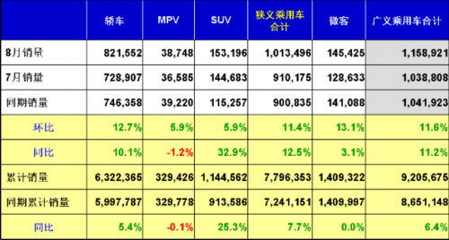 与乘联会上月的分析结论一致,8月车市如期出现明显的回暖。另外再增加一个重要因素,就是畅销的节能车产能的提升,使销量有所增大。由于今年经销商库存大,8月初放高温假的企业很多,但放假后企业却开足马力生产,使8月份的乘用车产量不降反升,厂家继续向经销商压库存,从而使8月的终端销量加出口量仍小于批发量,经销商和厂家的库存均有所增加。这种状态可能会一直延续到年底,这与我国经济体制有关,厂家受地方政府“稳增长”的压力不可忽视。乘联会分析市场是用终端销量,因为终端销量数据更能准确的反映市场情况,而且终端销量目前进行“技术处理”的少,库存对他没有影响,也是世界上大多数国家用来分析市场的数据。