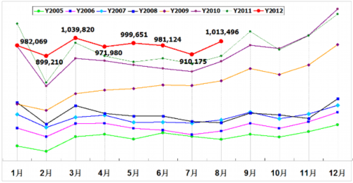 2005—2012年乘用车(轿车/MPV/SUV)月销量走势图