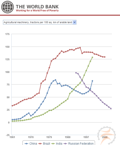 北京时间9月20日下午消息,据世界银行(微博)收集的数据,可得出如上的金砖4国过去49年(1961-2009)农业机械密度变化图。单位是每100平方公里可耕地平均的农业机械数量。这一数据可大致体现农业的受重视程度。