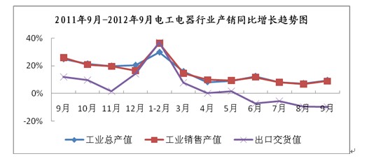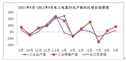 2012年9月,电工电器行业产销同比增长持平、环比增长均有大幅度上升态势;而出口交货值的同比有所下滑、环比增长则有大幅度地上升。