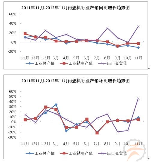 2012年11月,我国内燃机行业的工业总产值及工业销售产值的同比增速均比上月仍然有所小幅下滑,出口交货值的同比增速则有大幅度上升。机经网分析:与此同时, 工业总产值、工业销售产值的环比增速均比上月有小幅度的上升。出口交货值的环比增速则比上月有大幅度上升。