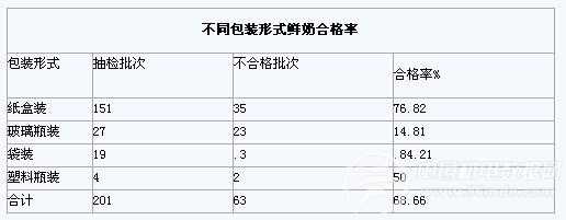 鲜奶共抽检4种包装形式,其中袋装抽检合格率为84.21%,纸盒装为76.82%,玻璃瓶装为14.81%。4批次塑料瓶装不合格2批次,因抽样数较少,不具有典型代表性。(详见下表)