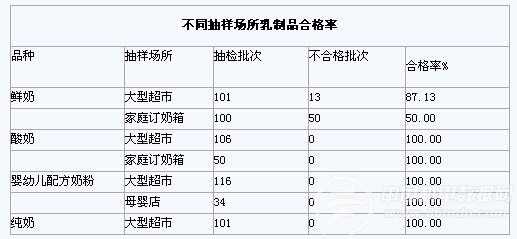 鲜奶抽样地为大型超市和家庭订奶箱,其中大型超市抽检的鲜奶合格率为87.13%;家庭订奶箱的鲜奶抽检合格率仅为50.00%。