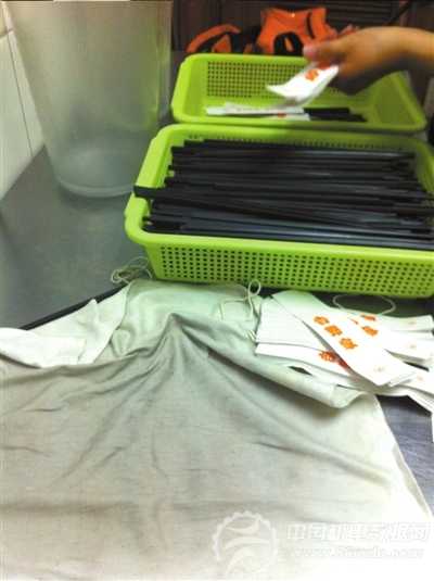 据一名店员介绍,筷子并不需要消毒烘干,“过一下热水,再用布擦下筷子,筷子也容易干。”擦筷子的是长宽约为50厘米正方形白布,但是由于多次使用和未定期清洗,白布已变成灰黑色。当店员正准备用布擦筷子时,另一位店员称,“这布多久没洗了,上面都有一股馊味了。”