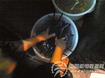 洗碗间内设有4个洗碗池,分别为洗涤池、清洗池、消毒池和漂洗池。中午12点半左右,店内达到就餐高峰,洗碗工刚处理完餐后垃圾,又马上去洗碗。由于没有时间,洗碗工有时只刷碗内侧,就将碗扔进清水池。“先泡上几分钟,再用抹布随便擦一下就干净了”,该员工称,洗涤池中的水一天只需更换四五次。而记者看到,在洗完上百套餐具后,洗涤池内的水已经没有了泡沫,上面漂着厚厚的一层油污,水已变成棕黑色。