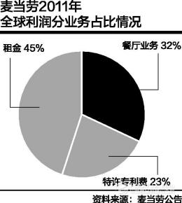 据麦当劳2011年年报,税息折旧及摊销前利润为99亿美元,其中32%来自餐厅业务,23%来自特许专利费,但最大利润来自租金,高达45%。截至2011年底,麦当劳在全球119个国家,拥有2.3万个物业,占分店总数的七成。