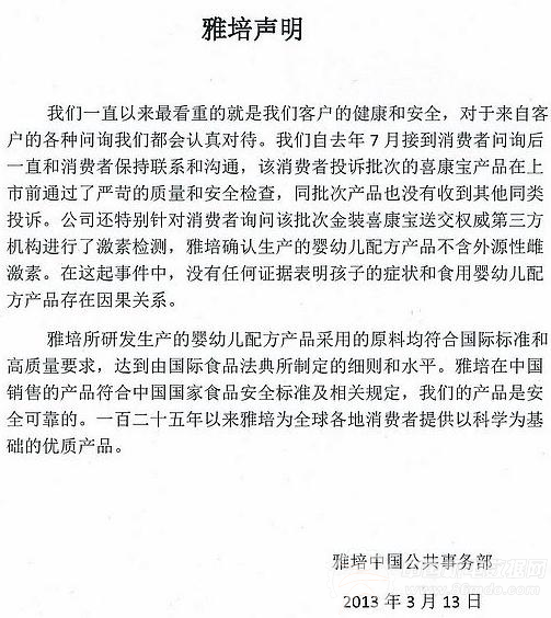 据雅培公关部回应称,该消费者于去年7月份投诉称自己宝宝在使用雅培喜康宝奶粉后,出现性早熟症状。接到消费者投诉后,雅培公司非常重视,立即对消费者投诉的批次进行调查和检测。经过调查,该批次喜康宝产品在上市前通过了质量和安全检查,而同批次产品也没有收到同类投诉。