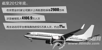 三是投保者主动辨识意识较差。2011年,北京保险行业协会搭建了航意险信息查询平台,但据该会提供的数据,截至2012年底,全部在京营业的85家公司累计上传航意险保单2900万件,涉及被保险人4106.9万人次,而主动访问平台查询真伪的仅5万多人次,约占1‰。