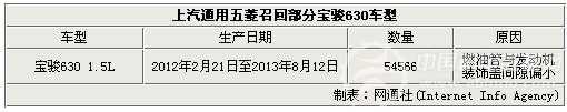 宝骏630于2011年上市,在动力方面分别搭载15L和1.8L辆款发动机至今,而此次涉及召回的车型则是1.5L版本。据了解此次将有54566辆车受到影响,其生产日期为2012年2月21日至2013年8月12日。由于供应商制造原因,本次召回范围内车辆燃油管与发动机装饰盖间隙偏小,如忽视该情况继续使用车辆,或将导致燃油管与发动机装饰盖工作效率受到影响,存在安全隐患。