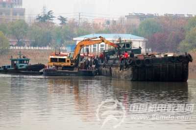 昨天中午,记者赶到芒稻河西岸路大堤上,远远地就能听见大堤下方的京杭运河河面上传来“嘟嘟嘟”的机械作业声。走近河岸可以看到海事部门的救援船只正将河中沉船里的煤炭驳载到另一艘船上。