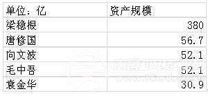 三一集团有一个亿万富豪群。根据2013年新财富500富人榜,三一集团有5人入围,董事长梁稳根以380亿资产位列第五,梁稳根更是2011年的中国首富。2012年三一集团更是有八人进入500富人榜,创造同一家公司上榜人数最多的记录。
