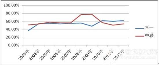 在收购CIFA之后的2009年起,中联重科的毛利率稳步提升,2012年小幅超过三一重工,2013年更是超过一个点。这种毛利率的反超对于两者的竞争格局的影响是极为关键的。