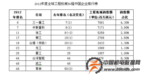 对于此次排名,《国际建设》编辑ChrisSleight说:2011年全球销售旺盛的驱动力来自欧洲、北美和日本工程机械市场的反弹,中国的一些大的制造商也获得了一些增长,但他们却正经历着国内十多年来最具威力的“寒流”。