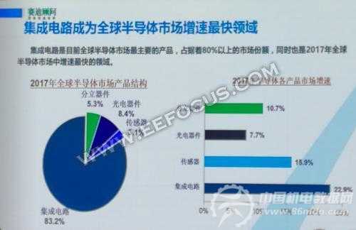从上图可以看出,目前集成电路是全球半导体市场最主要产品,占据80%以上的市场份额,同时也是2017年全球半导体市场中增速最快的领域。