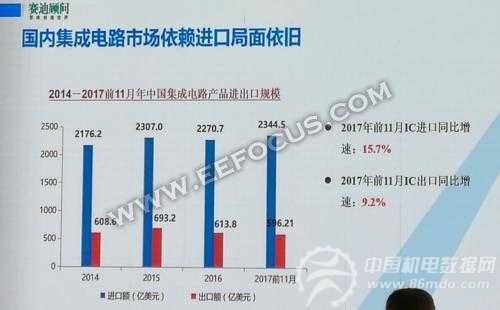 从近几年我国集成电路产业进出口数据来看,国内集成电路进出口一直处于逆差状态。2017年前11月IC进口同比增速为15.7%,而出口同比增速为9.2%。