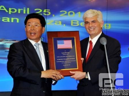 美国麻州港务局总裁迈克尔•里奥尼将“美国工人守护者”奖授予中远集团魏家福总裁