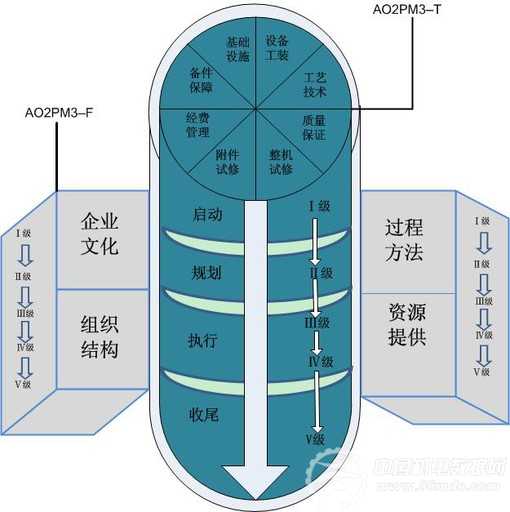 AO2PM3模型由两个相对独立的工程管理成熟度子模型构成,即企业级工程管理成熟度模型(AO2PM3-F)和团队级工程管理成熟度模型(AO2PM3-T)。AO2PM3-F包含企业文化、组织结构、过程方法、资源提供这四个在组织层面对维修线建设工程具有关键影响的过程,其管理成熟度由低到高分为I级至V级;AO2PM3-T的圆形截面部分包含了维修线建设8个方面的过程,圆柱体中启动、规划、执行、收尾代表了工程各阶段的特征和推进的方向,监控贯穿工程始终,其管理成熟度也由低到高分为I级至V级。