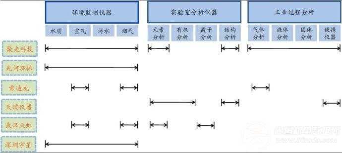 聚光科技自成立以来进行过6次并购,现有业务跨越环境监测、工业过程分析、实验室分析仪器三大业务领域。在环境监测、工业过程分析领域的市场占有率均居于前列。在实验室分析仪器的原子荧光、原子吸收市场上占据优势,受国际中高端分析仪器公司的竞争压力较小。
