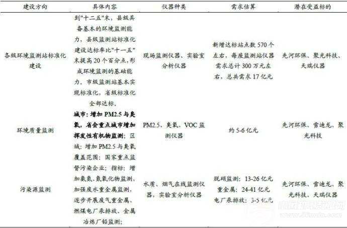 根据《国家环境监测“十二五”规划》、《环境空气质量标准》(二次征求意见稿)、环保部公布的PM2.5监测时间表等内容,PM2.5与臭氧是“十二五”期间主要增加的环境质量监测指标,涉及站点数量约1500个。这部分新增需求约3-4亿元。